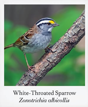 White-throated sparrows, found widely in the eastern U.S., flourish in diverse winter habitats. With ‘‘tan-striped’’ and ‘‘white-striped’’ morphs, the latter boasts a striking white and black crown as adults. Often seen at feeders and in bushy locales rich in seeds, they gather in large flocks, thriving in various environments.