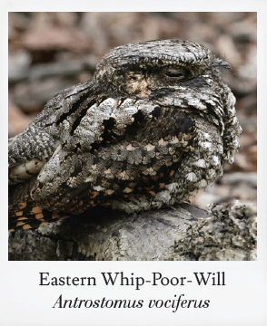 Eastern whip-poor-wills, iconic nightjars of the eastern U.S., are famed for their cinematic calls. Cleverly patterned in earth tones, they blend seamlessly with leaf-litter and bark. Spot them at night by their distinctive calls and eyeshine, often observed on warm summer nights when the birds are perched or crossing roads.