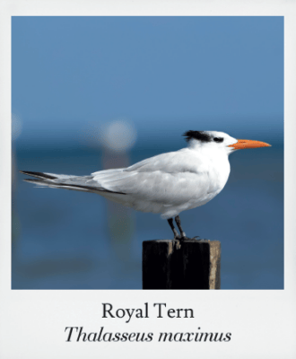 Royal terns, iconic in the southern U.S., boast sleek white bodies with gray backs, black crests, and masks during breeding. In non-breeding plumage, the black mask diminishes. Often found near the ocean, they feed on feeder fish, remaining common in summer and lingering into winter.
