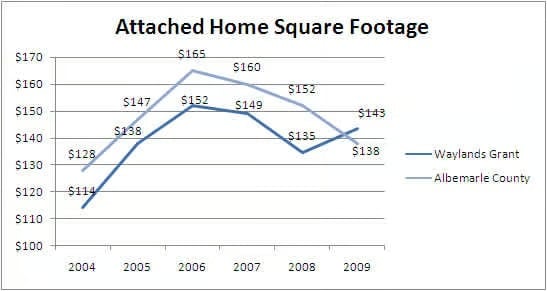 Just like the single family detached homes in Waylands Grant, attached homes have almost mirrored Albemarle County per square foot values from 2004-2008.Yet, 2009 may be a different story. With the townhome and attached home market in Crozet slowing significantly, Waylands Grant hasn’t been immune to the slowdown. In fact, since January of 2008, there have been 10 different attached homes in the neighborhood that have been listed and either were withdrawn or expired. In that same time, only 2 have sold (one of which was a foreclosure) and 1 is currently under contract.