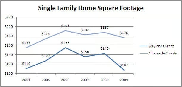 Single-family homes in Waylands Grant range in size from around 2100 square feet to almost 4000 square feet. According to the Charlottesville MLS, home prices and values in Waylands Grant have followed an almost identical path as overall values of single-family homes in Albemarle County through 2008.2009 prices show a relatively sharp decline – off almost 25% from 2008 prices and down significantly compared to overall Albemarle County home values. While prices clearly show a drop, there are a few factors to take into account.