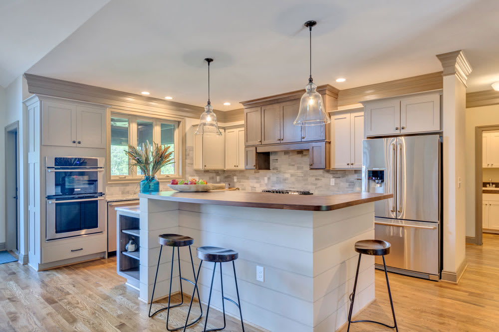 “We find it important to integrate green features that make our homes both beautiful and energy efficient. In this modern farmhouse, which received the 2015 Craftsmanship Gold Award recipient in the Asheville Parade of Homes, the wood walls were built from wood that was destined to be white oak hardwood flooring but was culled for having one ‘defect’ or another. We were able to salvage it and found that with a little care, it had just the right amount of character for our purpose. This home not only makes use of reclaimed materials, but also features energy efficient mechanical components such as a hot water reclamation geothermal heating and cooling system with an energy recovery whole house ventilator. By capturing excess heat produced by the geothermal unit, we are able to send preheated water to the gas-powered on-demand water heater, which increases efficiency as well.” Kevin Hackett, President