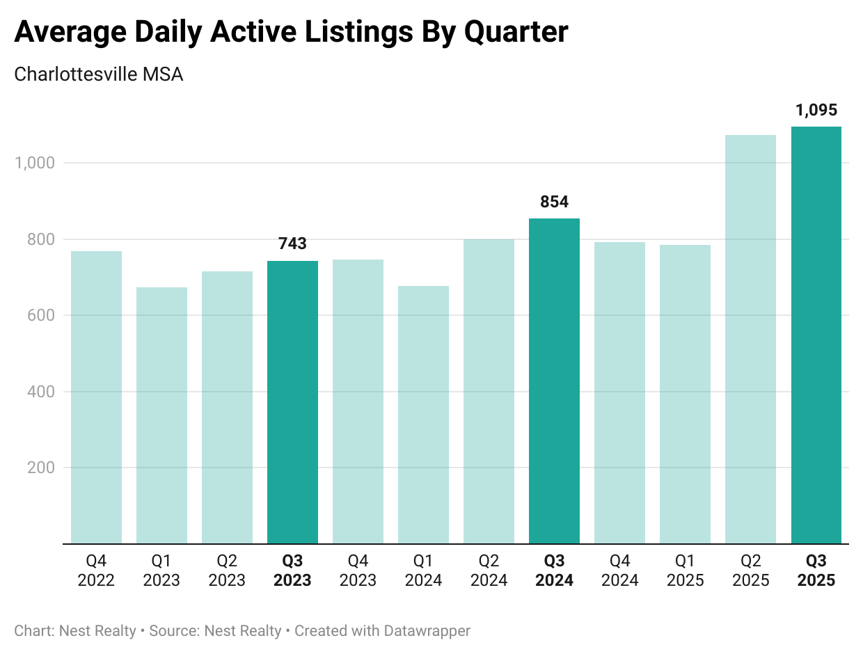 - The average number of active residential listings in the third quarter of 2025 was 1,095, a +28% jump from 854 in the third quarter of 2024.