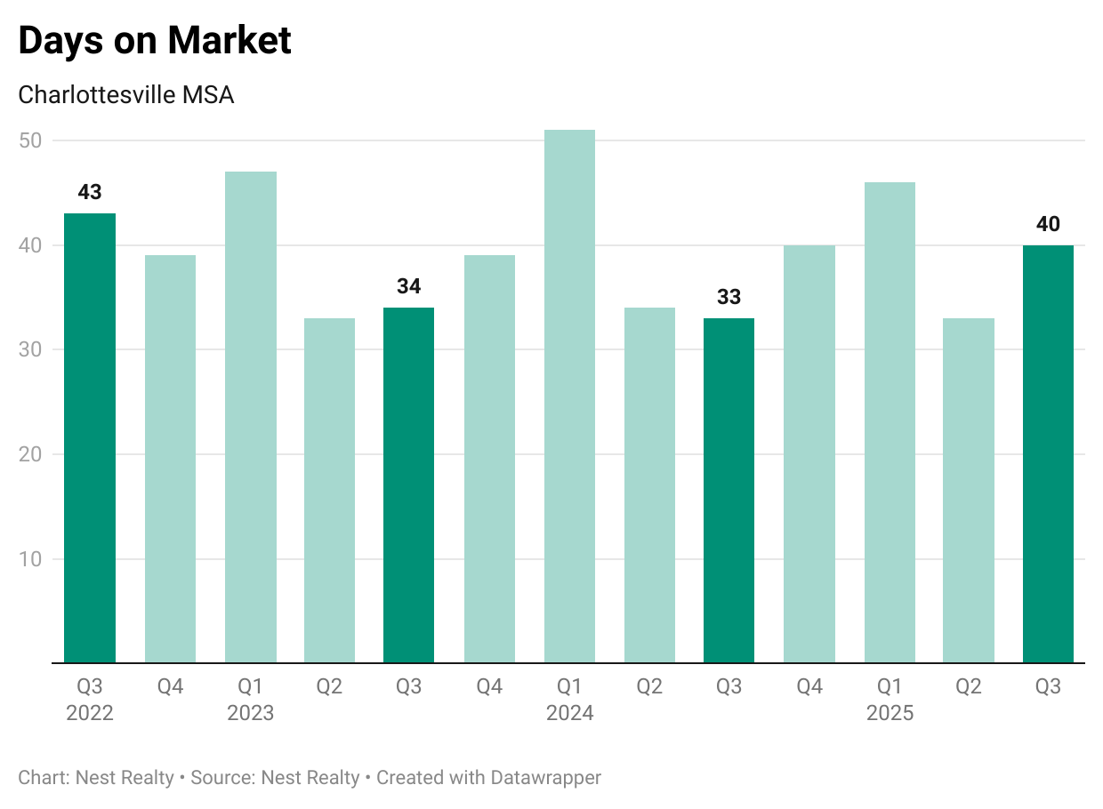- Days on Market (DOM) averaged 40 days in the third quarter of 2025, up +21% from 33 days in the third quarter of 2024.